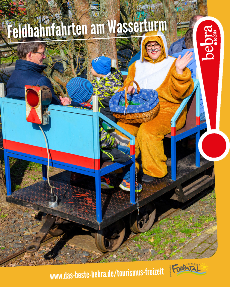 Die beliebten Züge „Biber Blitz“, „Wasserturm-Express“ und „Bebraer Bimmelbahn“ fahren alle 10 bis 15 Minuten die etwa zwei Kilometer lange Fahrt nach Weiterode West und zurück. Fahrkarten (Einzel-, Dreier- und neu Zehner-Karten) gibt es an der historischen Fahrkartenausgabe im Wasserturm. „Frau Osterhase“ wird zu Gast sein – und für die kleinen Besucherinnen und Besucher eine Überraschung dabeihaben.